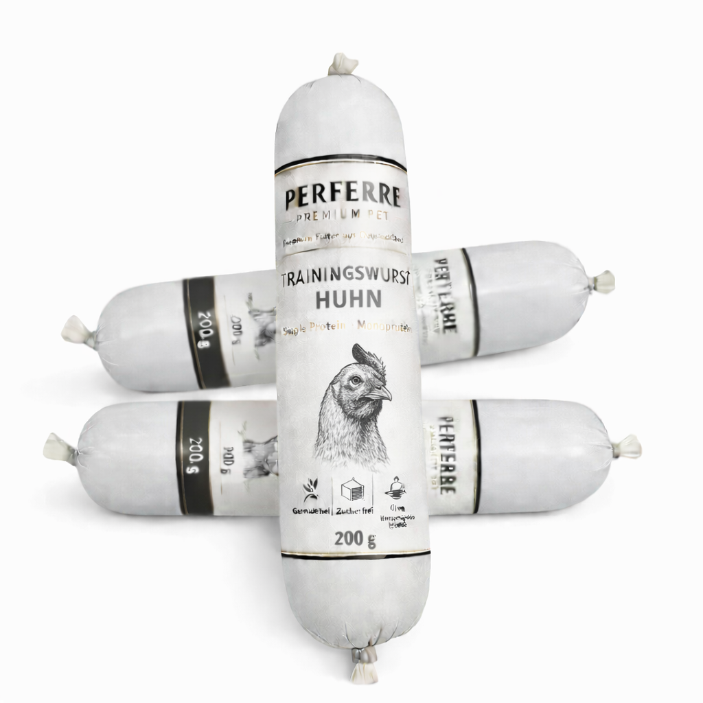 Die Perferre Premium Pet Trainingswurst Huhn liefert pure Motivation auf Abruf. 100 % Monoprotein Huhn, schnittfest, ohne Zucker, ohne Getreide, ohne Bullshit. Ideal für Welpen, Sensibelchen und echte Energiebündel.