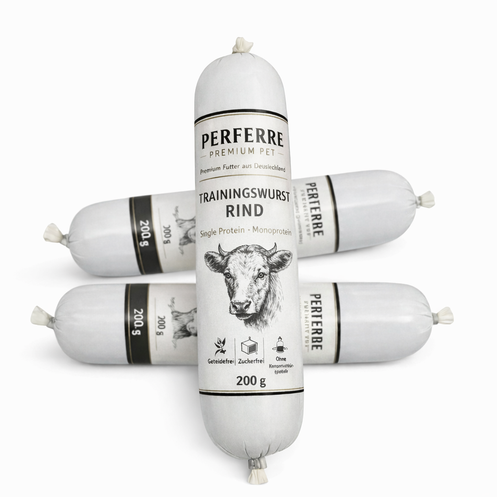 Die Trainingswurst Rind von Perferre Premium Pet besteht aus nur einer tierischen Proteinquelle und eignet sich ideal für Hunde mit Allergien oder Unverträglichkeiten.